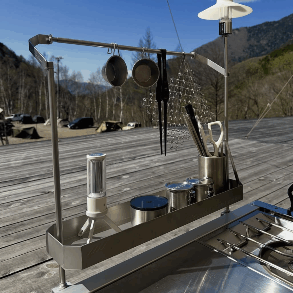 ソリッドハンガー ハンガートレイ🫣✨ 組み立ても簡単だし トレイが広くて沢山おけて調理中も楽🥺!! ハンガーが奥にあるので トングかけてもコップに重ならないのもめっちゃ良き。 ランタンスタンドにもなるよぉ🫡👍 お気に入りのシルバーアイテム🩶